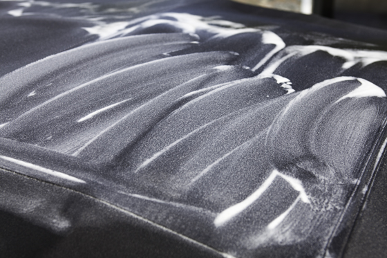 You will need some time to do a good job of this, a few basic materials and either fair weather or a garage with enough space to get around the car properly. I started with basic clean of the roof with a vacuum cleaner and a brush. Before getting to work on the roof it is worth going round all the seals and drainage channels and giving them a good clean – this is the area most likely to cause leaks. Once complete I moved on to the Soft Top Canvas Cleaner (the fabric version in this case although they also sell a vinyl roof cleaner). This is applied to a damp roof with a clean paint brush. Renovo recommend dampening the roof with a plant mister. Using a clean new paint brush makes a lot of sense; the last thing you want is a tint of the last colour you painted your bathroom all over your roof! The quality of the brush doesn’t really matter so I picked up a set of paint brushes from the bargain bin of the local DIY store. Renovo suggest once applied to leave this working away for 40-60 minutes to remove stubborn dirt but on this warm, dry day it had dried up completely in 20 minutes even in the shade. The next step was to start scrubbing with a sponge and warm water. A lather appeared immediately and it took quite a lot of scrubbing and rinsing before all the soap was washed away.